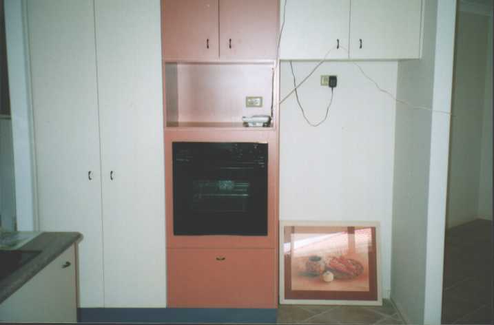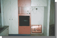 The wall oven and microwave bay with pot storage at bottom, and pantry and fridge compartments.